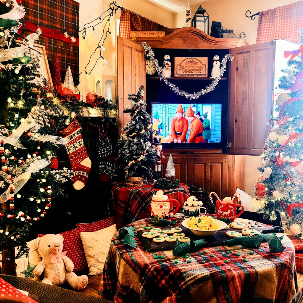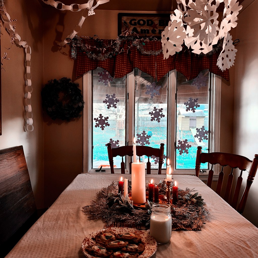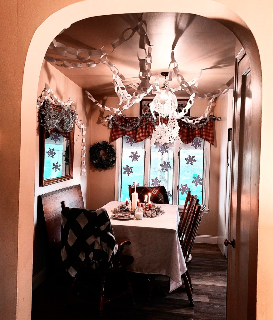 I try and decorate as cozy as can be with lots of lights to brighten the evenings as the dark settles. This year we decorated the kitchen in an Elf inspired way with paper snowflakes and snow chains. It’s been quite fun…..just paper, staples and command hooks. with a few garnishes from the dollar store. I also create a cocoa bar for those cold evenings and movie days. I have cocoa, marshmallows and candy canes.